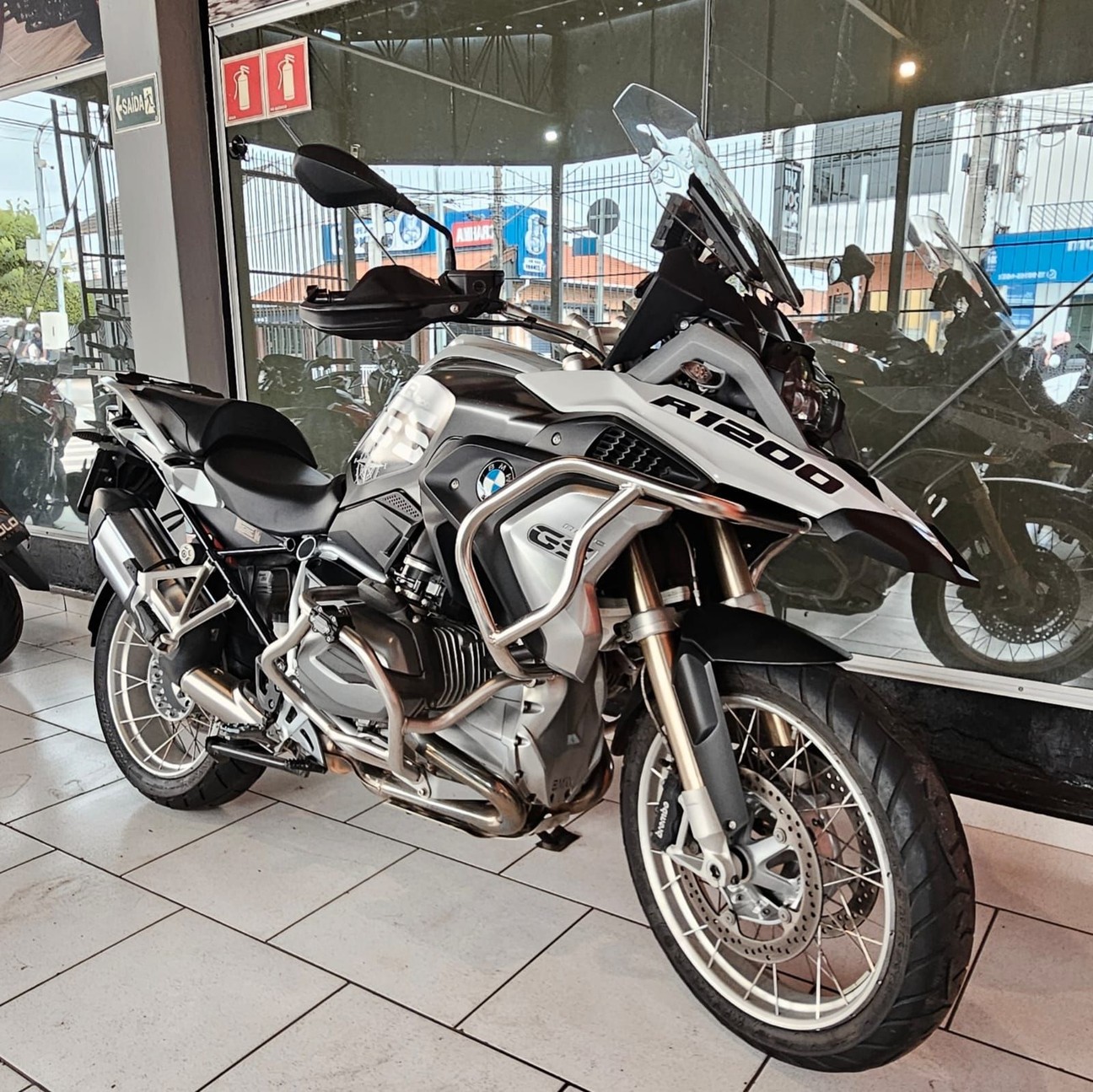 BMW R 1200 GS PREMIUM + Moto em estado de zero, sem detalhes, com protetor de motor e carenagem e suporte de baú.